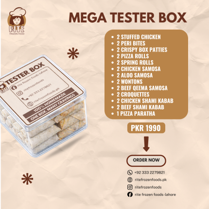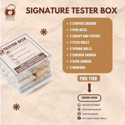 2 Peri Bites 2 Stuffed Chicken 2 Pizza Rolls 2 Crispy Box Patties 2 Spring Rolls 2 Chicken Samosas 2